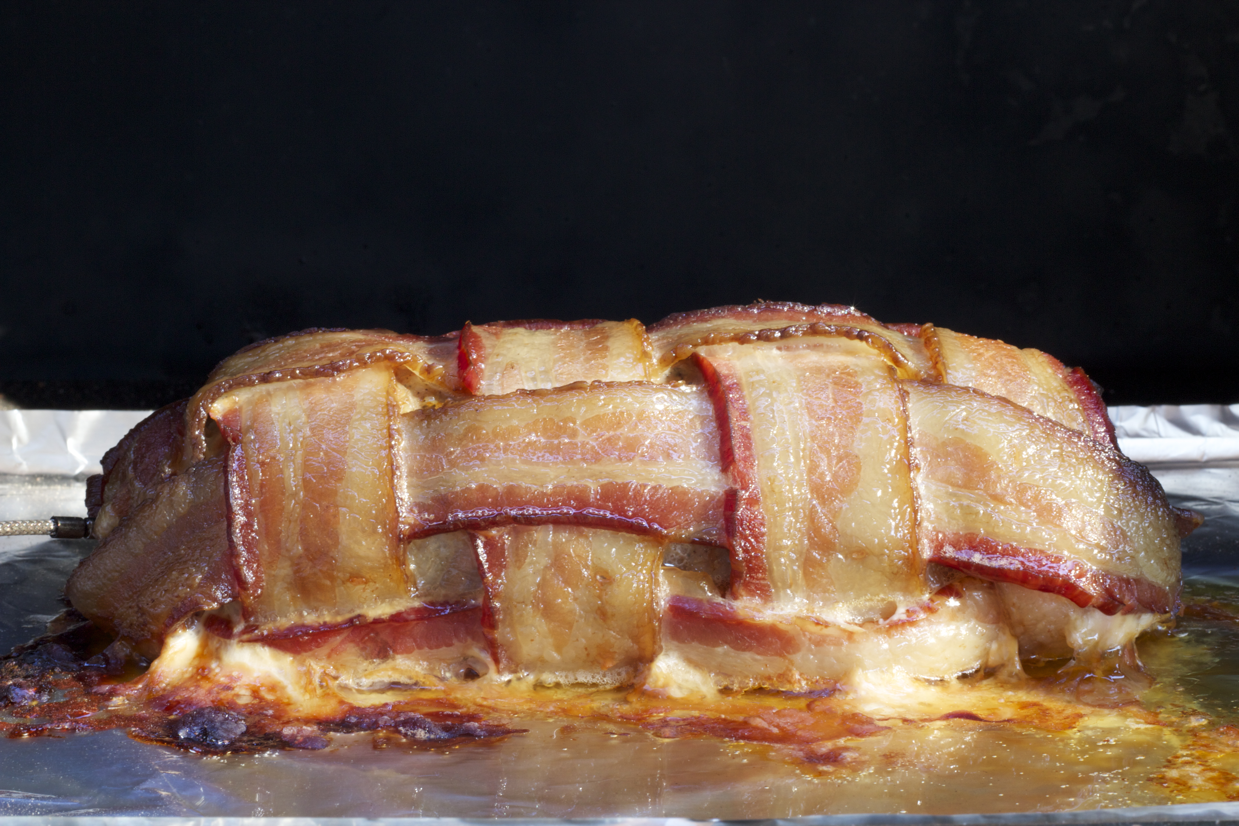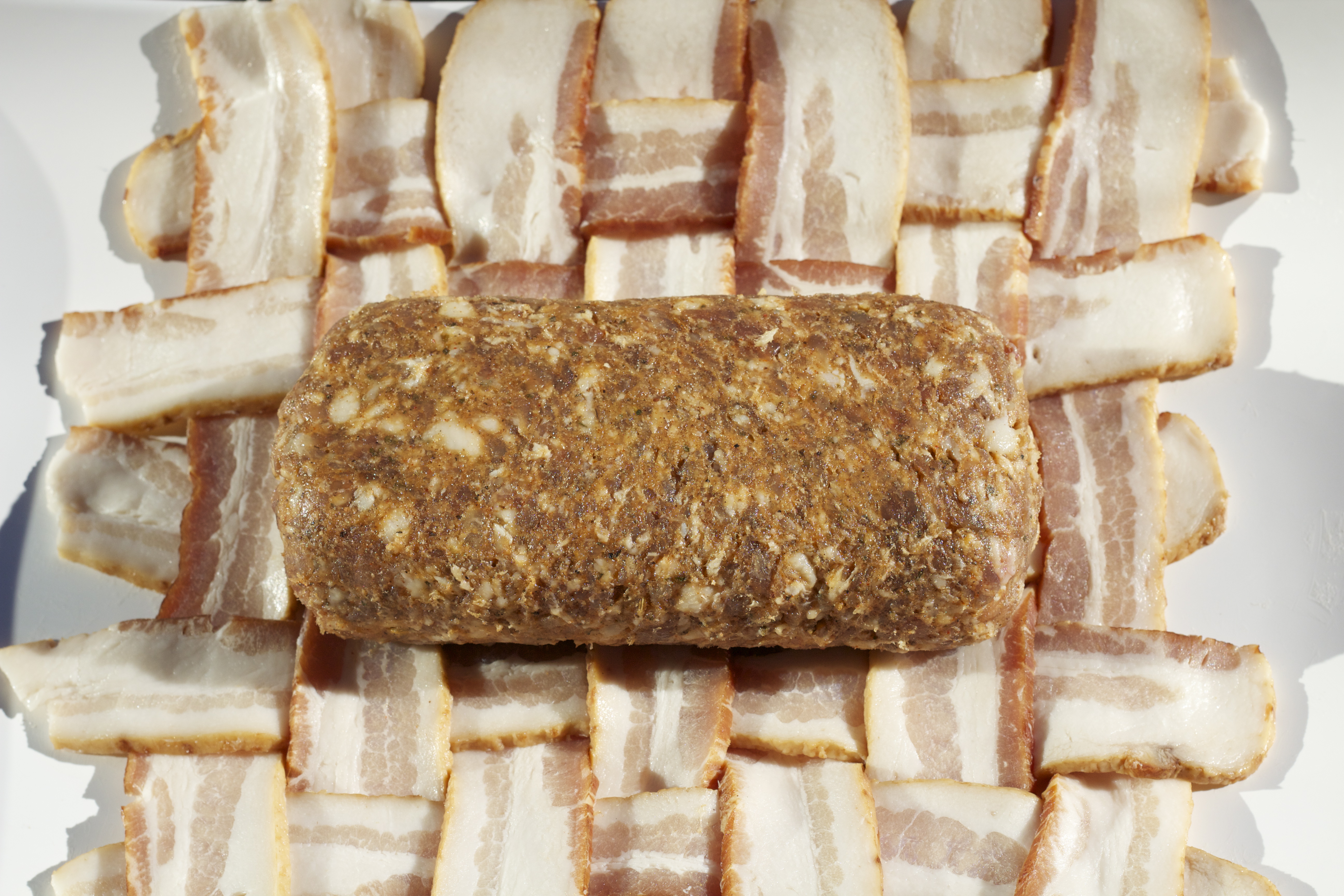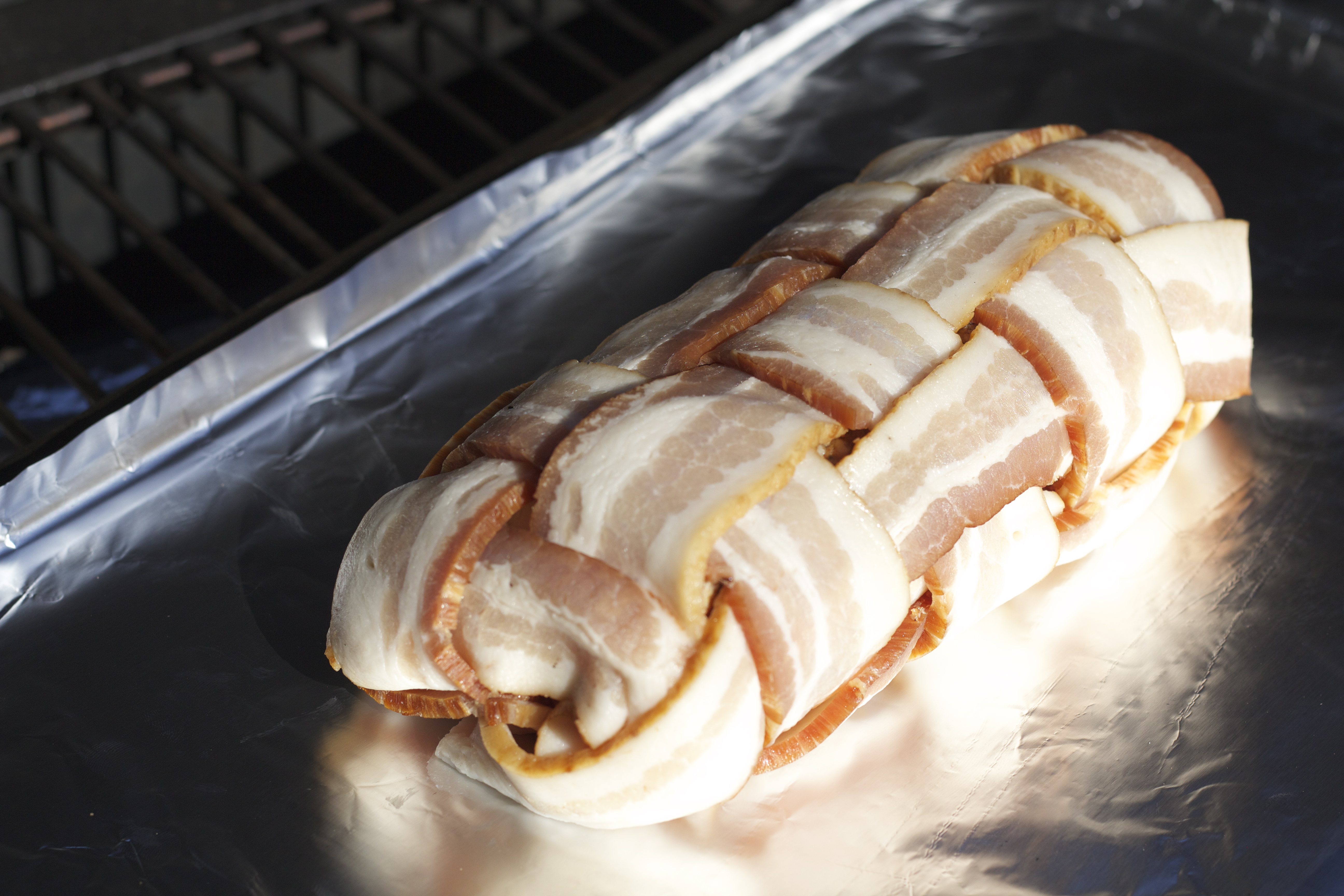 Use thin sliced bacon and weave the pound of bacon like you learned back in elementary school this takes a little time so have fun with it. Remember you are going to wrap you’re sausage with this weaved bacon blanket. Now grab the 1 pound of sausage, form it into a mini loaf and place the loaf in the middle of the bacon blanket.